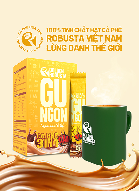 Golden Robusta tự hào giới tiệu Gu Ngon với tinh chất hạt cà phê Robusta Việt lừng danh thế giới. Chắt lọc từ nắng, từ gió, từ tinh túy đất trời của cao nguyên đại ngàn để gói hương vị cà phê nguyên bản gọn trong một gói. Ngon đúng gu như về đúng quán.